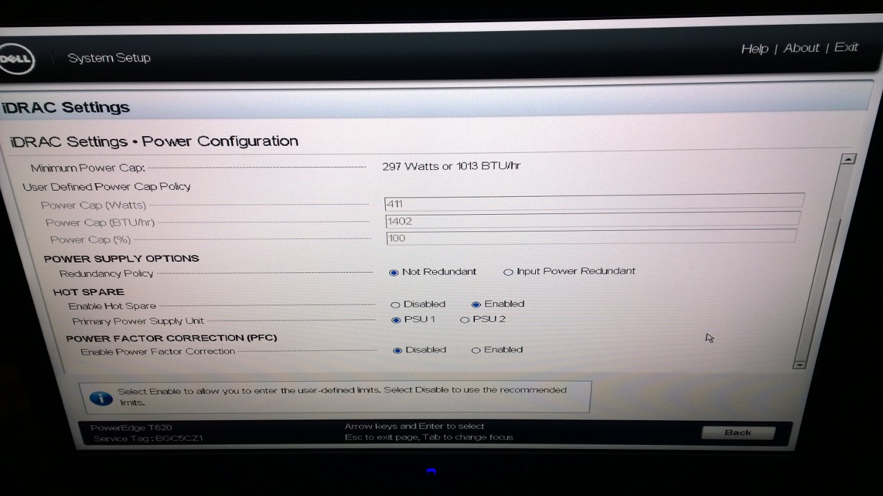 Power Configuration is a really powerful option which provides the capability to set hardware level power capping for the system as well as set the configuration of the redundant PSUs (up to 2). Used in conjunction with Dell OpenManage and vCenter DPM the iDRAC power capping capability can be used to keep server energy consumption at predictable levels and shift resources around as needed when those levels are exceeded in order to maintain the balance. Ultimately this can get as aggressive as choosing to shutdown VMs if needed in order to stay within a “power budget” if architected correctly:
