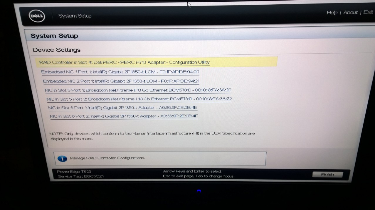 With the iDRAC rockin’ and rollin’ there is only one top level System Setting sub-menu left – Device Settings. Here we can see enumerated the installed and recognized devices in the system as well as access additional configuration detail. In this build we have the iDRAC, Intel NICs both add-in and embedded, the Broadcomm 10Gb/s NIC and the PERC H710: