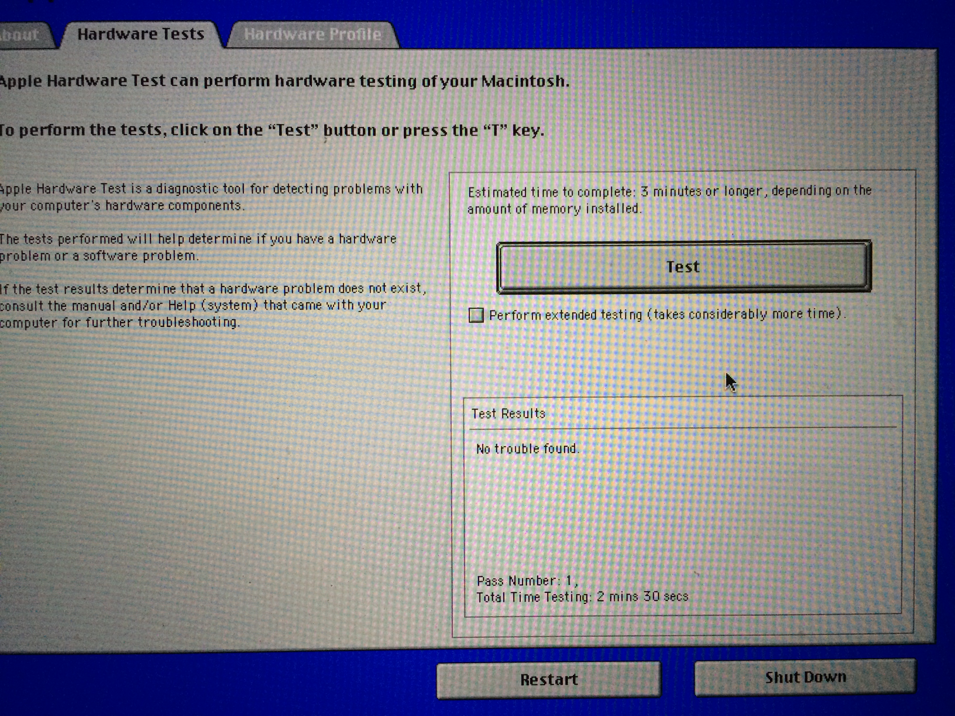 First, memtest in OS. Lots of failures. Instant failures too. As a matter of fact I’ve never seen such a horrific memtest result! It was honestly a bit of a wonder the thing could even boot! Thinking that maybe the software result was anomalous (memtest for OSX is a bit old at this point and in theory doesn’t support anything newer than 10.5.x) I decided to do the old faithful Apple Hardware Test. If nothing else that utility is always a cool walk down GUI memory lane!