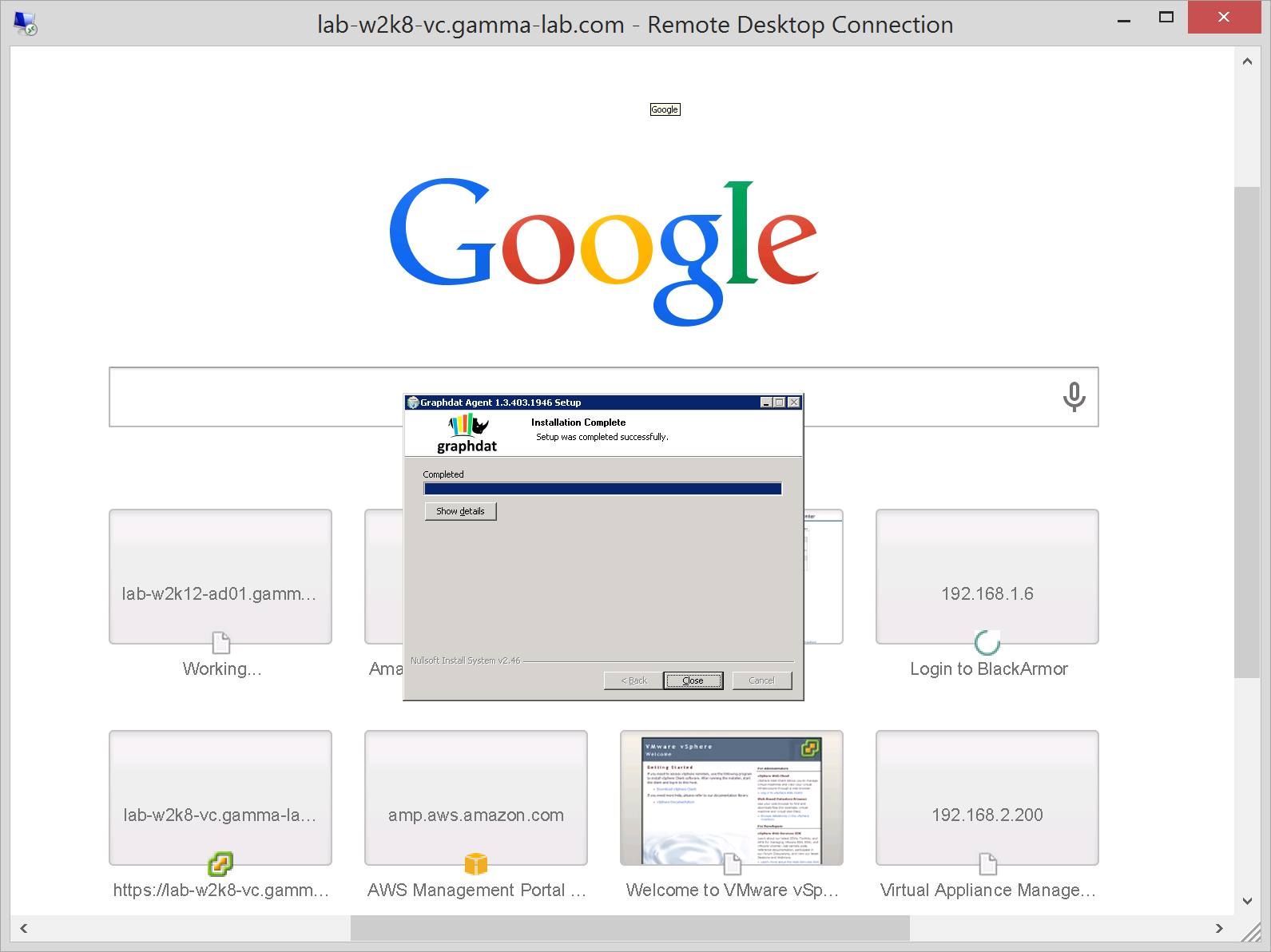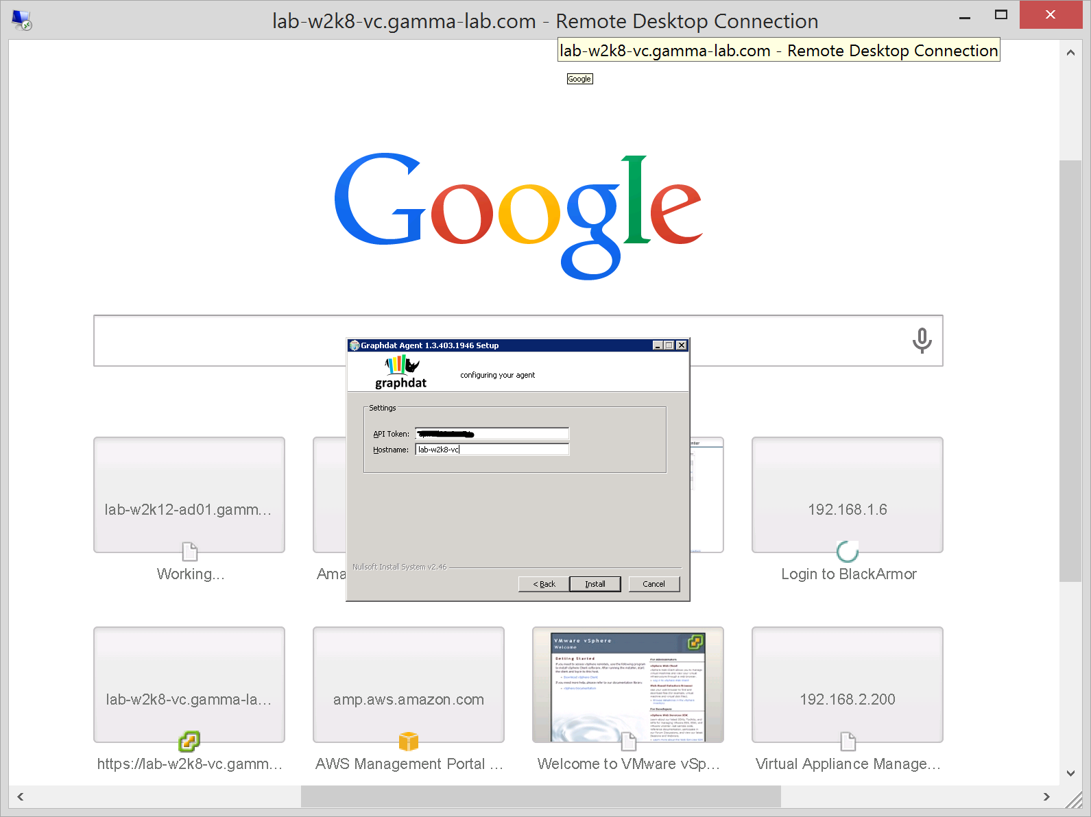 I decide that monitoring my vCenter would be neat (since it’s busy all the time), so I choose that as my first server. I opened an RDP and lobbed the URL in. It’s a path to a file on S3 (big shocker) which instantly downloads a (very small) agent installer: