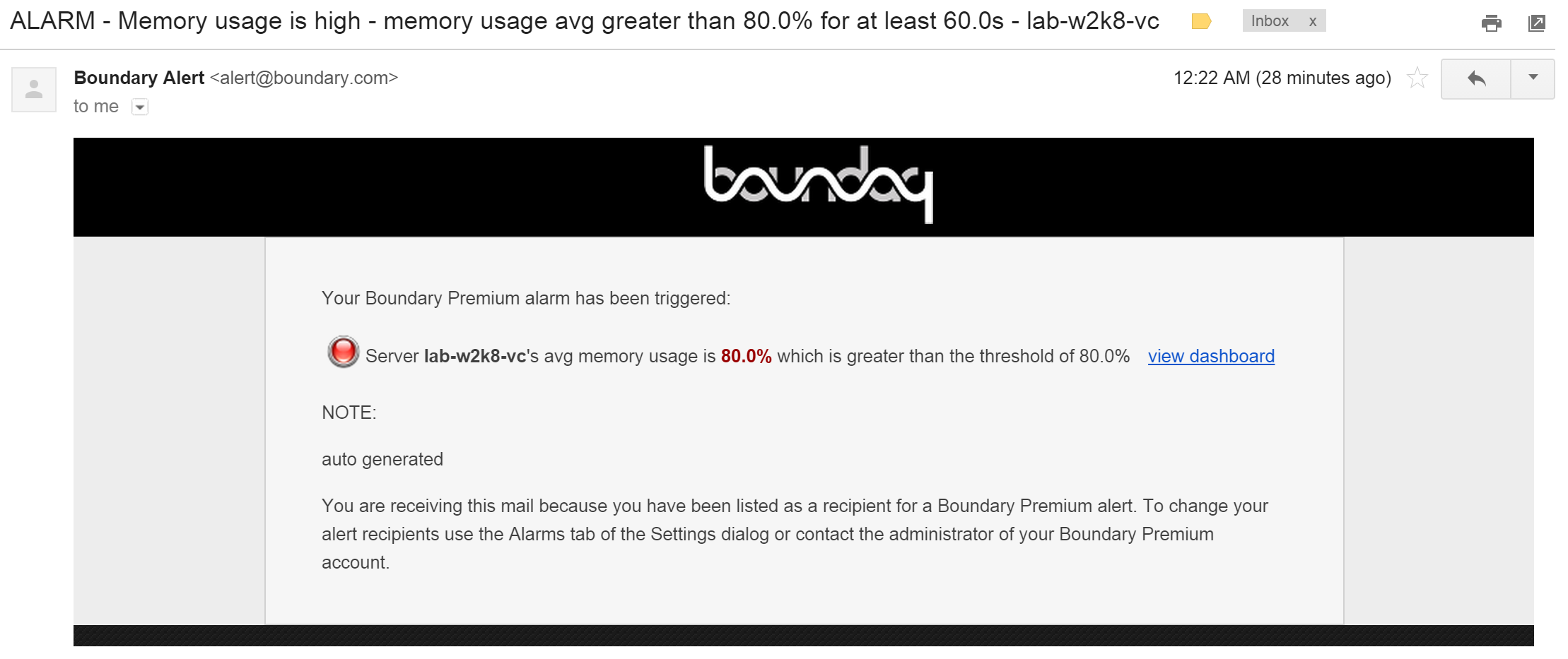 And… it wasn’t long until I got my first alert! (hey, it’s a lab!). Came directly in email without me having done any configuration at all, so a default set of alert thresholds is configured for you automatically. Nifty!