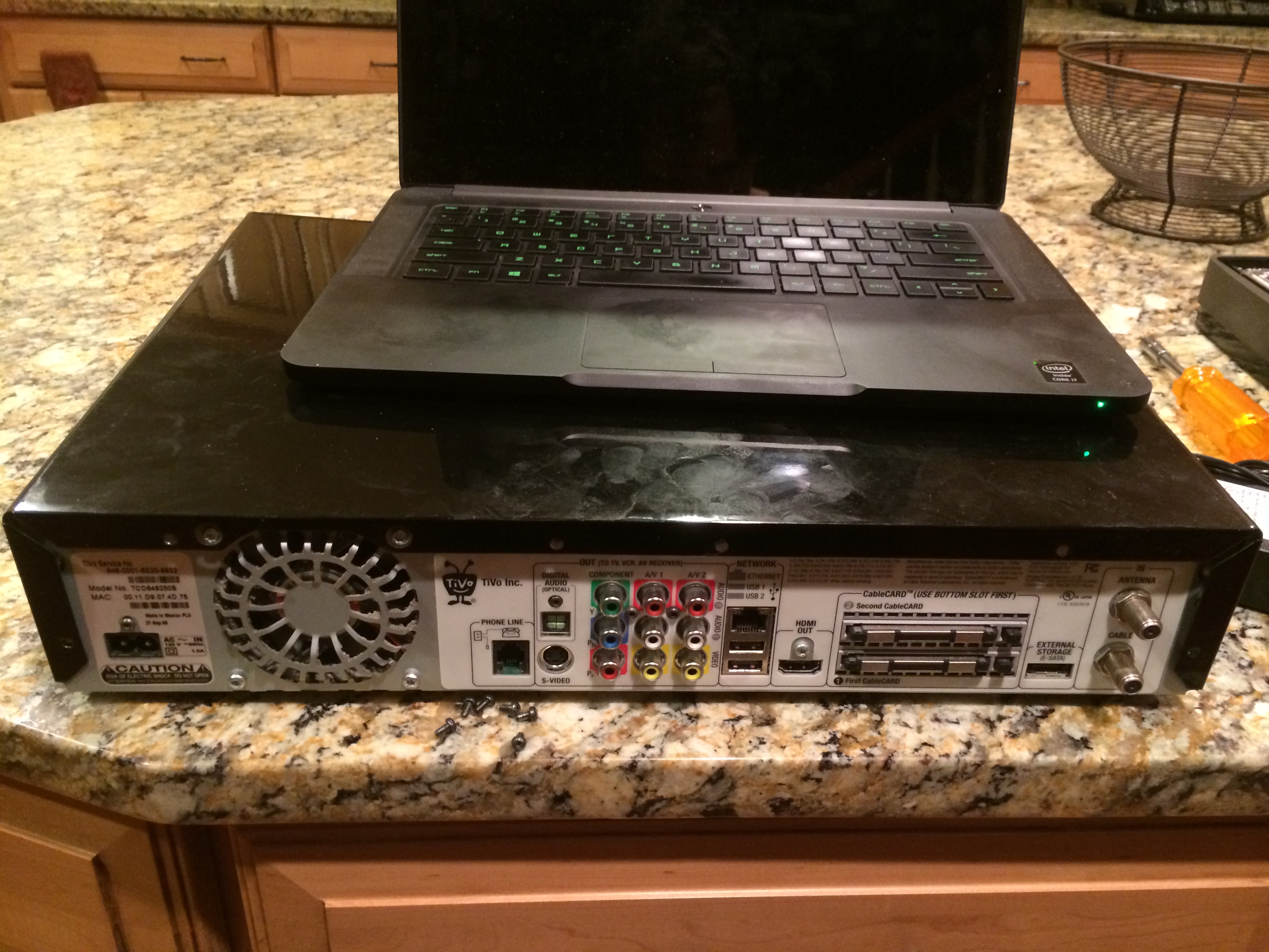 Thankfully, the physical aspect of this procedure is very easy (unlike an XB360 teardown which I also did this week, but that’s a different entry!). The TiVo is held together with just 6 T10 screws on the back: