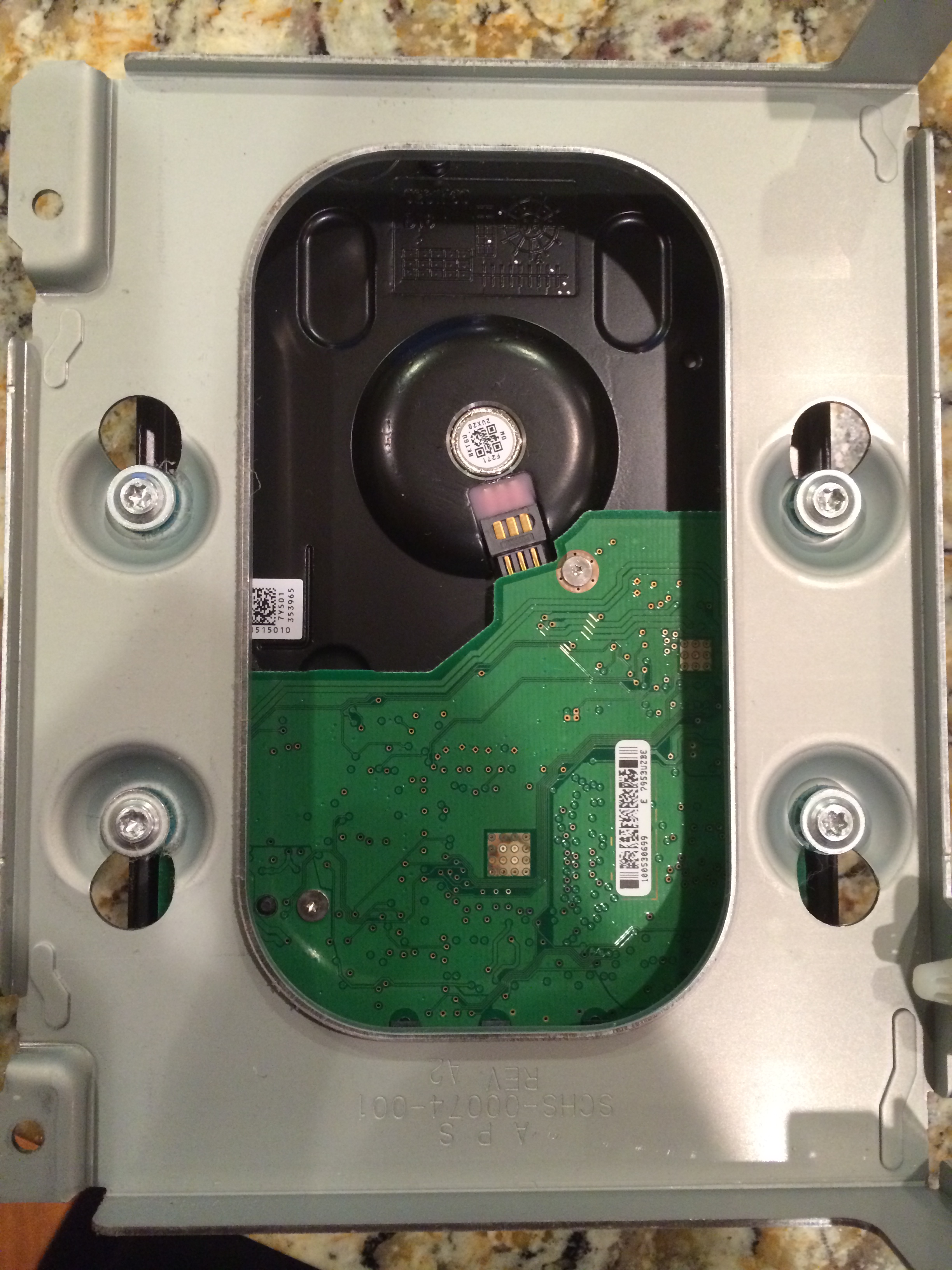 With the screws removed, the entire drive platform lifts out. The drive is mounted to the platform at the base with 4 T15 screws: