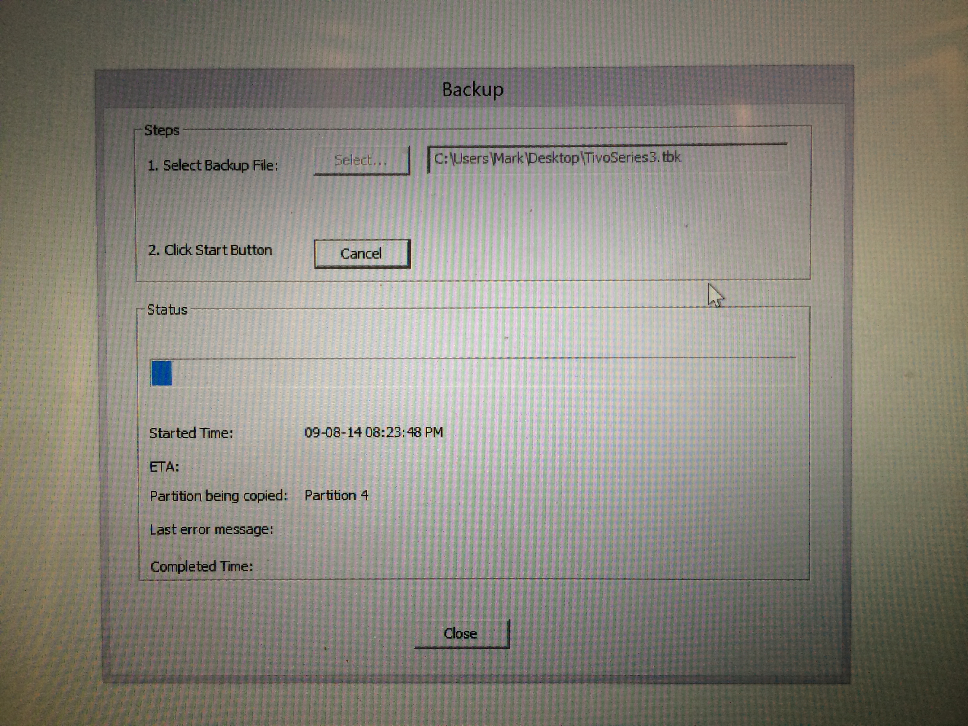 With the TiVo drive selected, we can now go ahead and grab our precious TV Data. From the File menu, select Backup Tivo Drive. Give the backup a filename and location and click Start (note, the back files are very small):