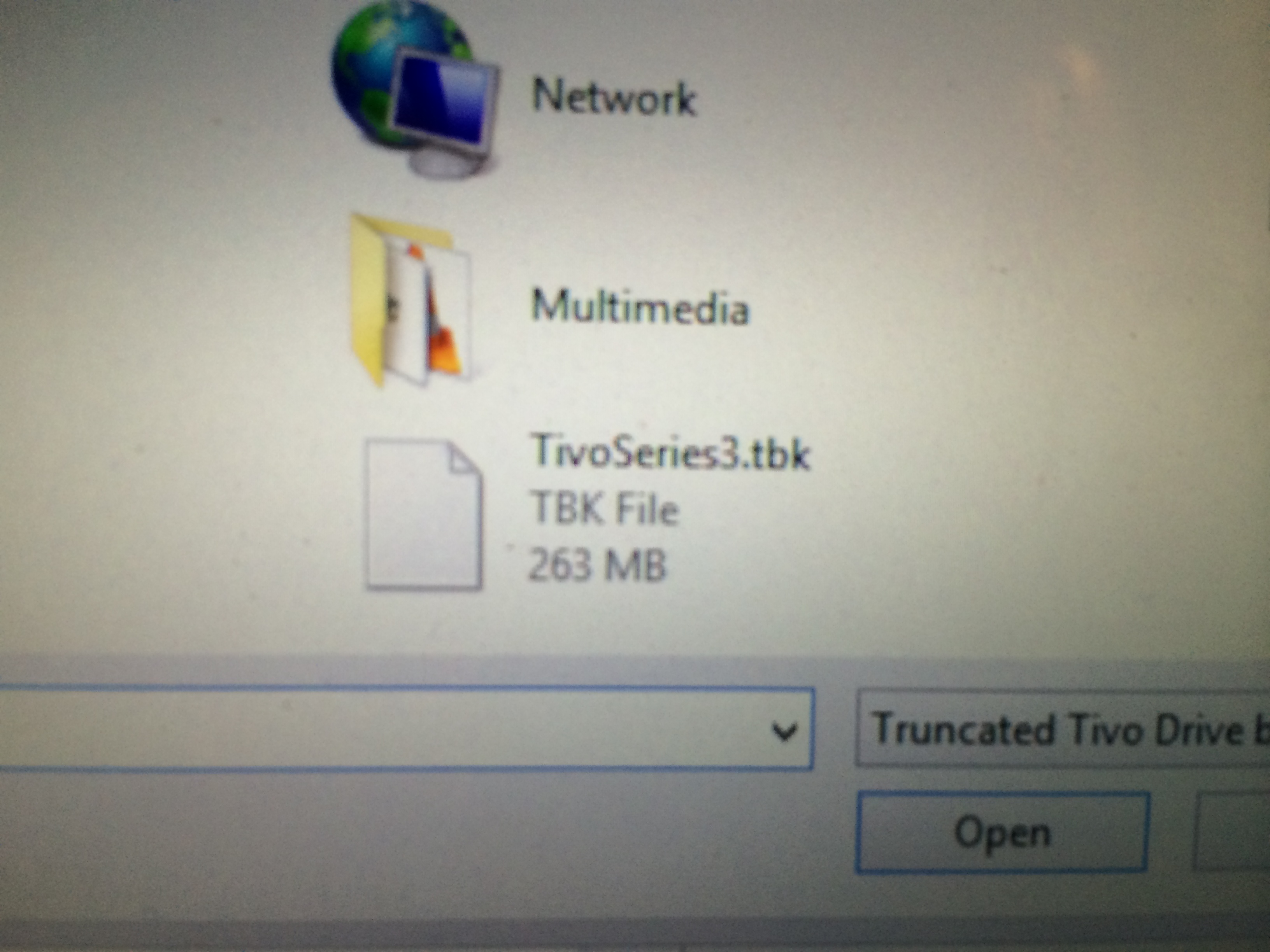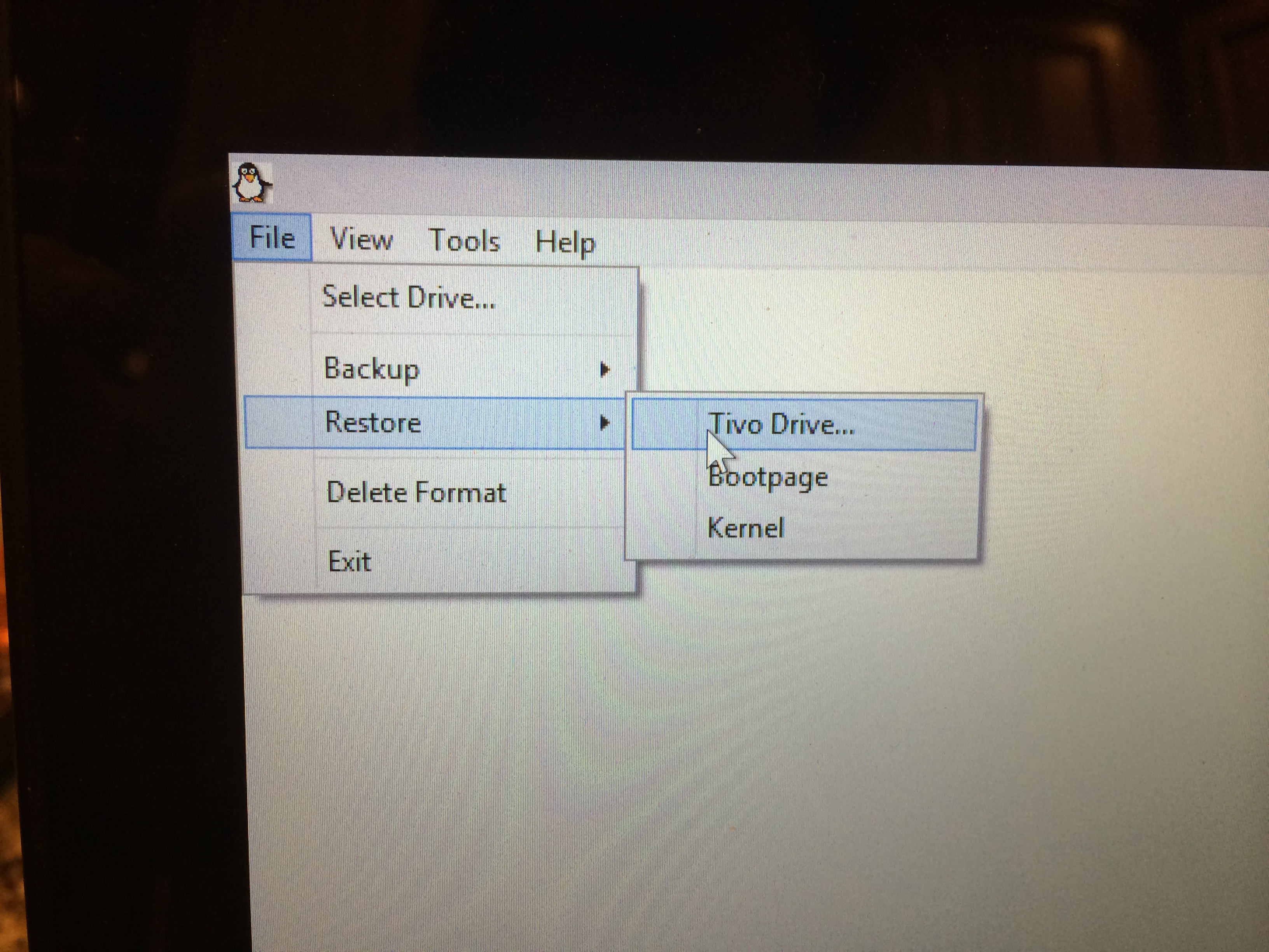 Back to the File menu, this time we choose Restore and Tivo Drive: