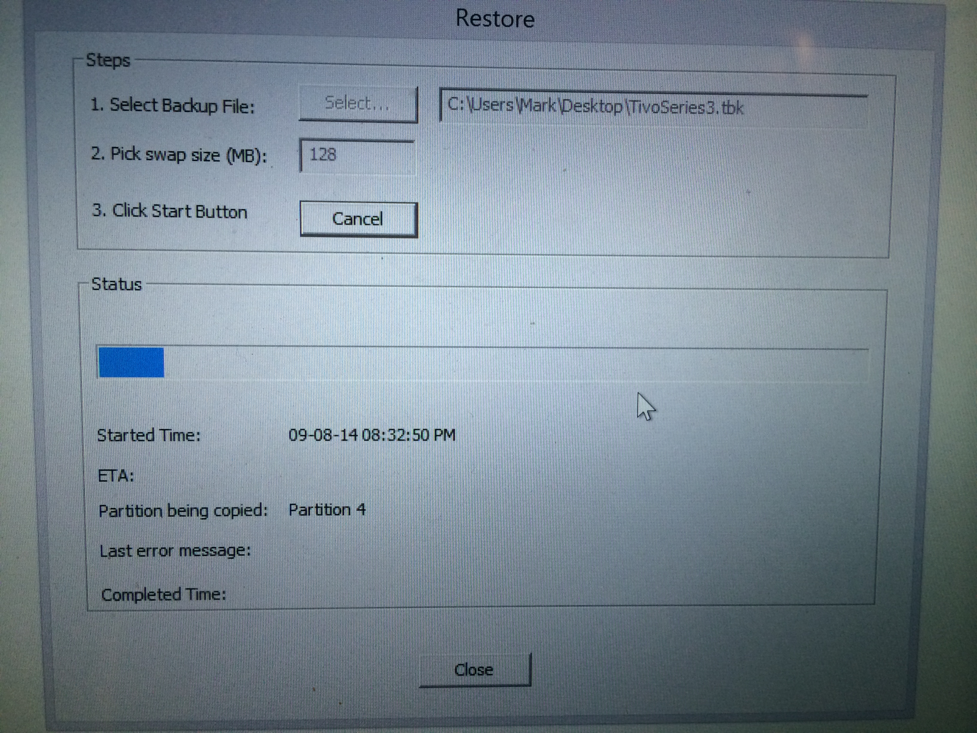After selecting the previously created backup file, the process will now reverse with the image being dumped onto the new drive: