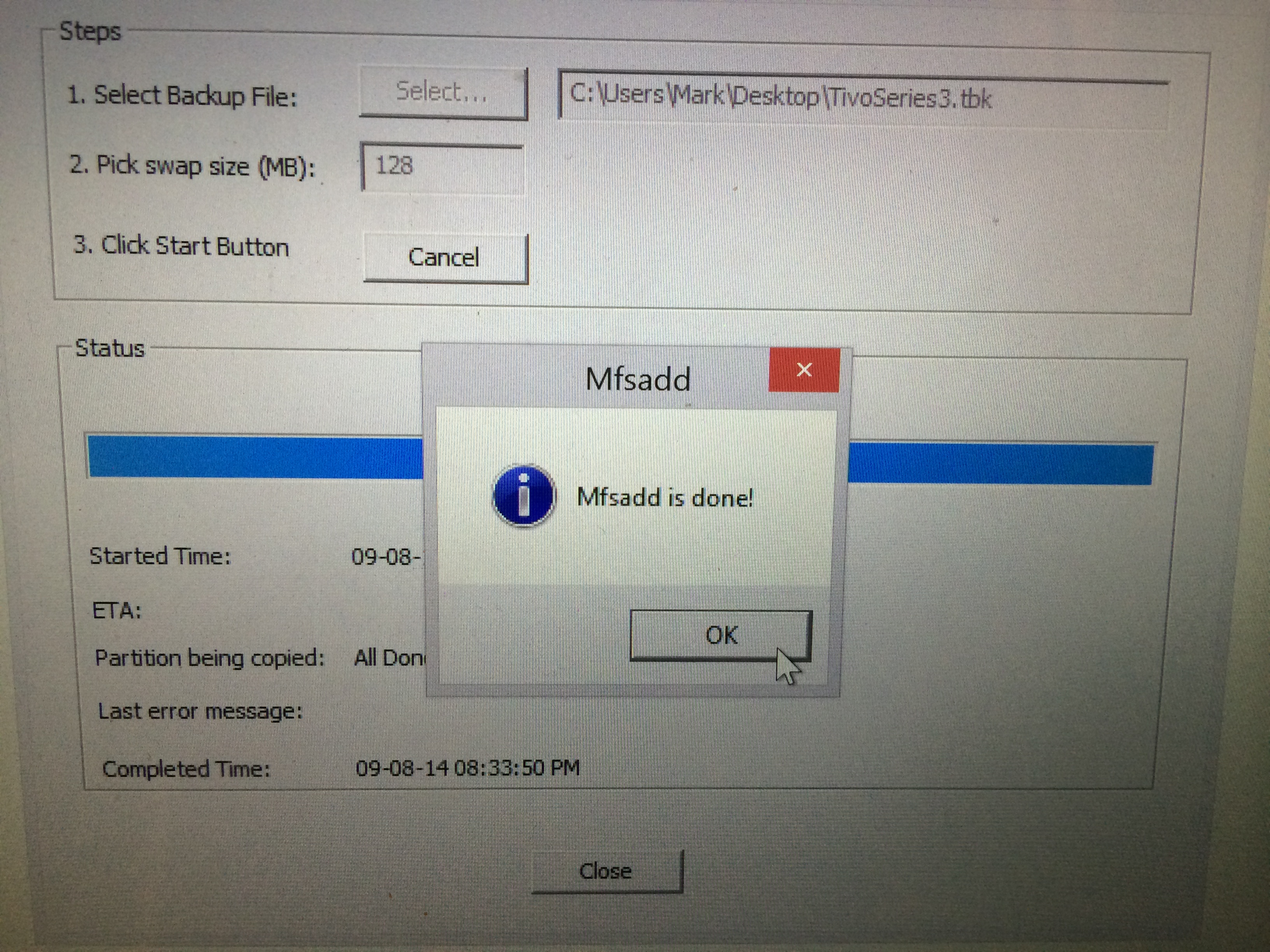 3) WinMFS – this little gem of an open source project is the key to everything. The lightest of lightweight Windows utilities, WinMFS allows you to mount, and operate on, TiVo formatted drives in Windows. Alternatively, since the TiVo runs Linux, a TiVo drive can be mounted on a Linux system, but the format is proprietary so you’ll still need MFS tools to perform the operations required