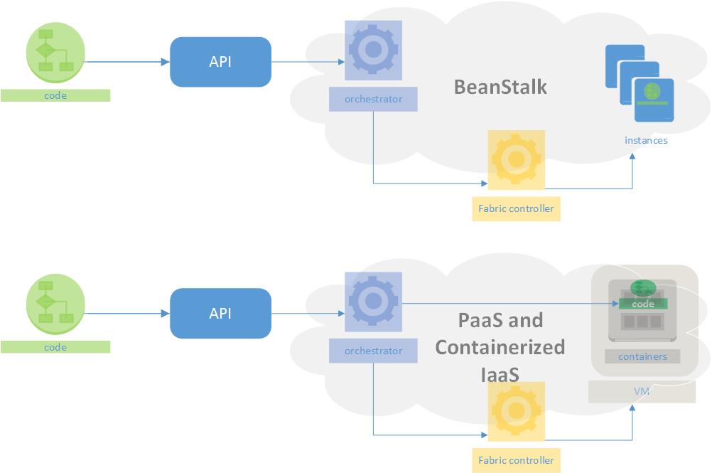 This is why, barely 2 years into the shift to cloud design patterns and cloud service consumption and operation models, we are already seeing a shift to containers (and also “SDDC”, but that’s a topic for another day) What do these technologies mean to the new wave of IT folks though? Well first let’s take a look at what we’re actually dealing with. I will focus on two rival approaches. The first is Amazons “Elastic BeanStalk”, which is how AWS answers the “Platform as a Service” question, and the next is the traditional “Platform as a Service” approach, and more recently the “Containers as a Service” (for lack of a better term) approach being provided by Google and Microsoft. To kick things off, a quick diagram: