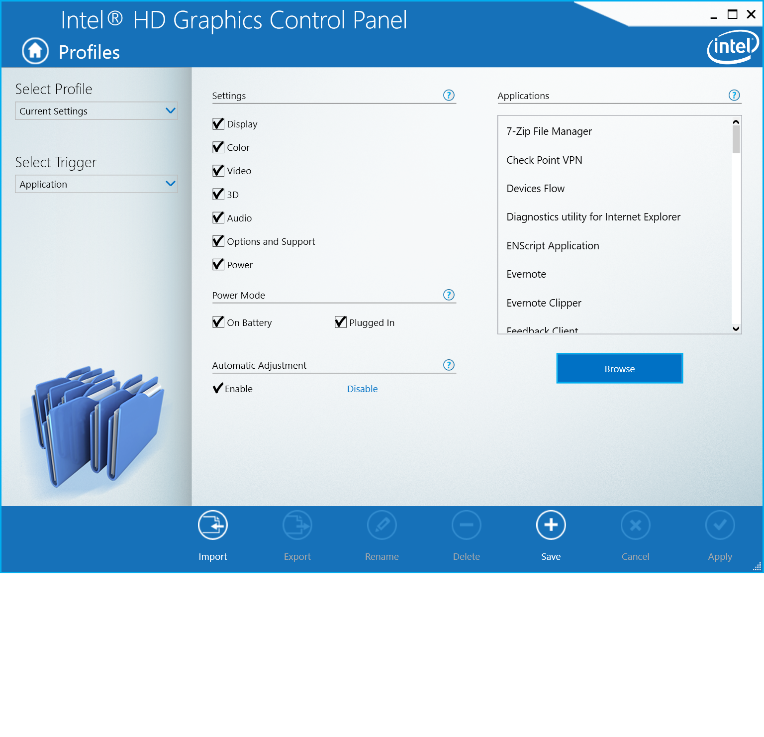The other work around is functional, but can be a bit onerous for anyone who has a large catalog of games. The solution here is to utilize the Intel Profile Manager capability to trigger a res switch when a game is run. That can be found in the Intel HD control panel under “Profiles”: