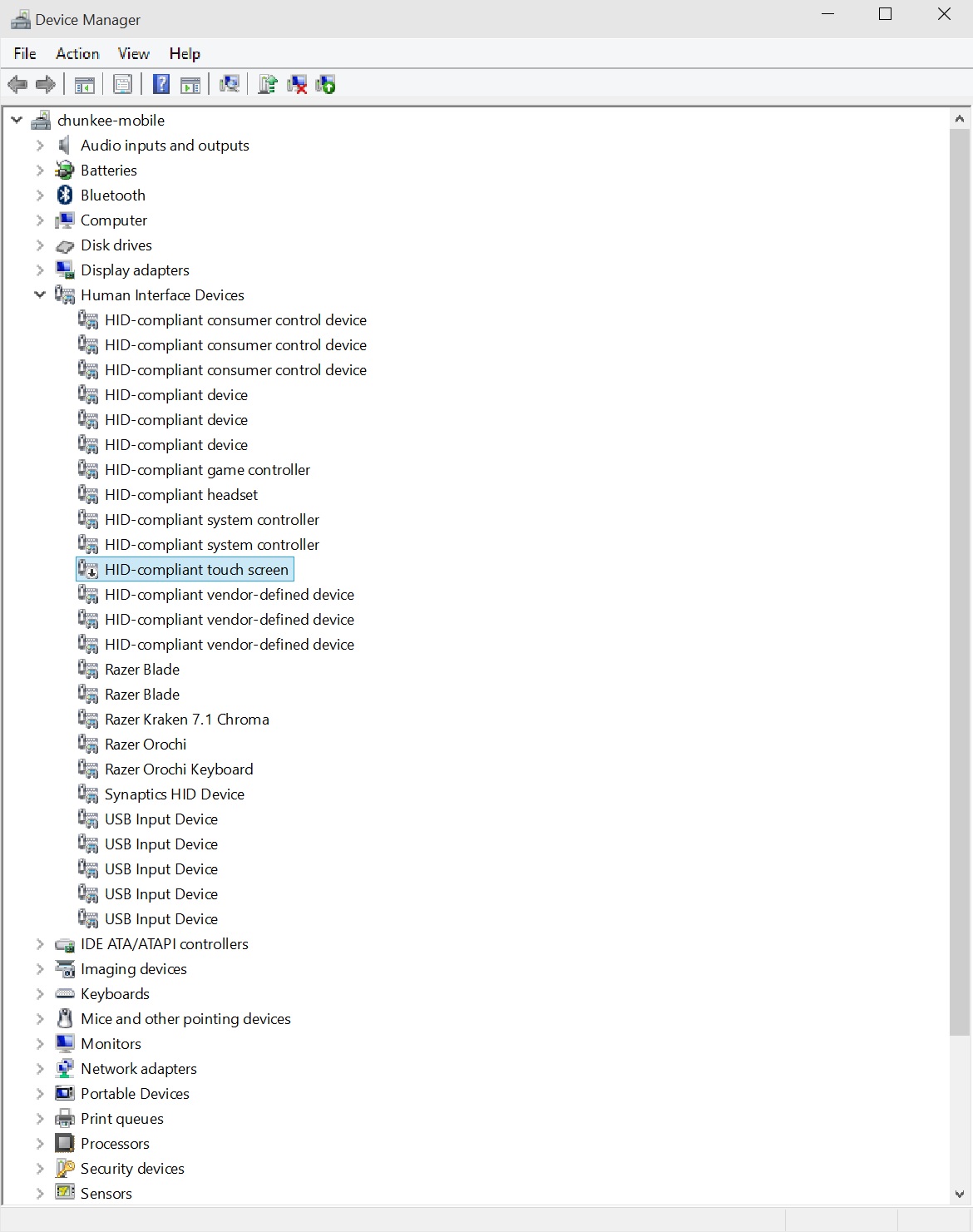 First, the easy button. Disable touch features in Windows. For whatever reason, the touch panel HID driver is the actual root cause of this issue. It can be disabled in Device Manager: