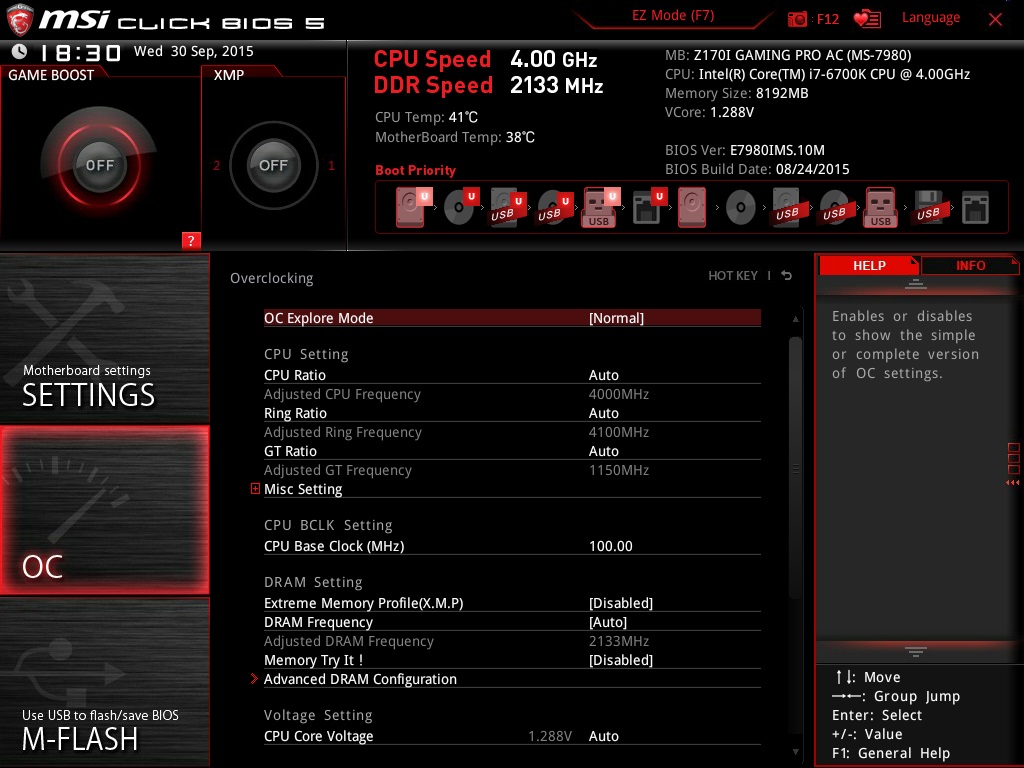 With the physical build complete, it was time to fire up the Nightblade. The system configuration UI, as expected of a UEFI system, is very slick and features both basic and advanced modes as well as tools for overclocking and system monitoring. In addition, there are single button settings for “Game Boost” and XMP. “Game Boost” is auto-pilot overclocking that pushes the CPU to 4.4Ghz under load. Once enabled boot up triggers a warning to not directly change any advanced BIOS settings. I experimented with this setting but couldn’t get 100% reliable boots with it on. I’m really going for stability in this build, and I personally find the auto-pilot overclocking solutions to be hit or miss anyhow, so I left it disabled. XMP (eXtended Memory Profile), on the other hand, is a more well known quantity. Ideally XMP should cause the BIOS to read memory setting parameters from the memory itself. Enabling XMP correctly set the RAM settings to 3200Mhz CL15, but unfortunately once again stability suffered.