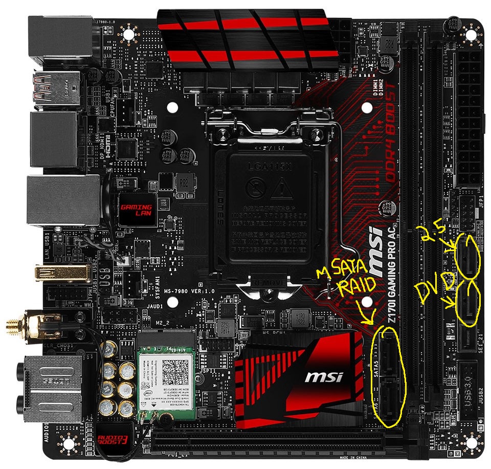 The Z170i provides 4 SATA ports. Two of these SATA ports (ports 1 and 2) can be configured as SATA Express and these two are also shared with the M.2 slot on the back of the board. If the M.2 slot is used in SATA protocol mode, the 2 SATA ports (and by extension SATA Express support) are disabled. In this case the M.2 slot is being left empty and there is no SATA Express. Unfortunately, for some reason, having the 2 mSATA SSDs connected to those ports resulted in extremely unstable performance with one of the drives inevitably falling out of the RAID in successive reboots and either one, or both, intermittently disappearing from the BIOS device list. This was a really frustrating issue as it prevented installation of the OS at best, and left the system spontaneously booting into uEFI recovery mode at worst. Luckily the fix turned out to be as simple as moving around the ports the devices were connecting to. The config that did the charm is pictured below: