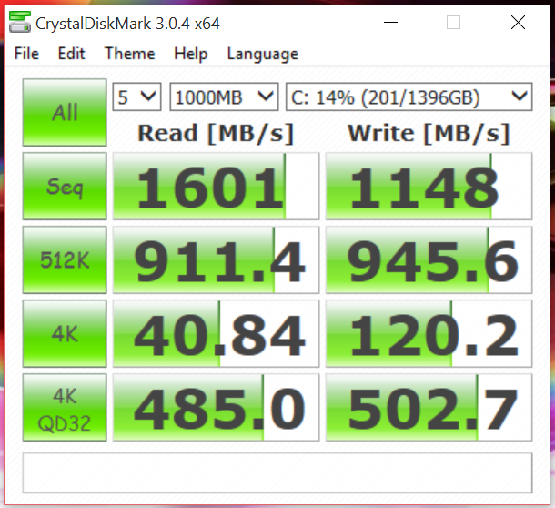 With Windows installed, the first thing I decided to do was test the RAID. Given the plethora of initial disk problems, and the mixing of mSATA and 2.5, it seemed like a good idea. Crystal Diskmark results were good: