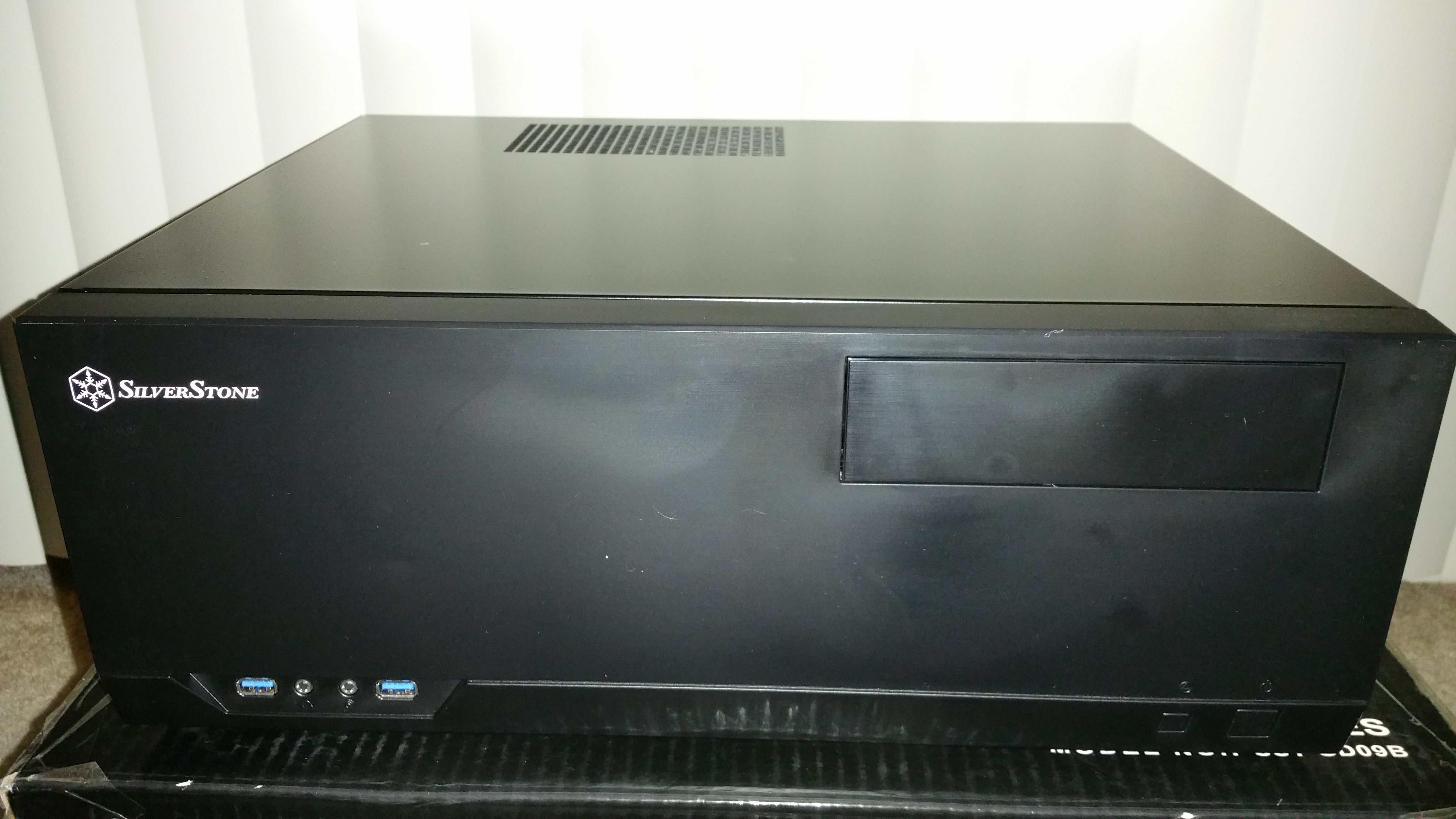 In the SFF gaming PC build entry I mentioned how the necessity of moving into a shoe box was the mother of the invention that lead to a full powered gaming PC in a SOHO NAS sized box. Astute readers may also remember that when I was less space challenged the Complaints HQ lab also included a pretty beastly server in addition to the gaming monster. Well obviously the Dell T620 isn’t apartment friendly and so had to go, but now that things have settled, I did discover about 2300 cubic inches of free space into which a server could potentially go (for the mathematically challenged this is roughly 16 x 20 x 7). Now this is admittedly not a lot of space, but as it turns out it is roughly the dimensions of the typical HTCP form factor. These cases also bring the benefit of being generally wife/living room/normal human friendly in terms of their design. After looking at a bunch of them, and factoring in a strong cost bias, I settled on the Silverstone Grandia GD09: