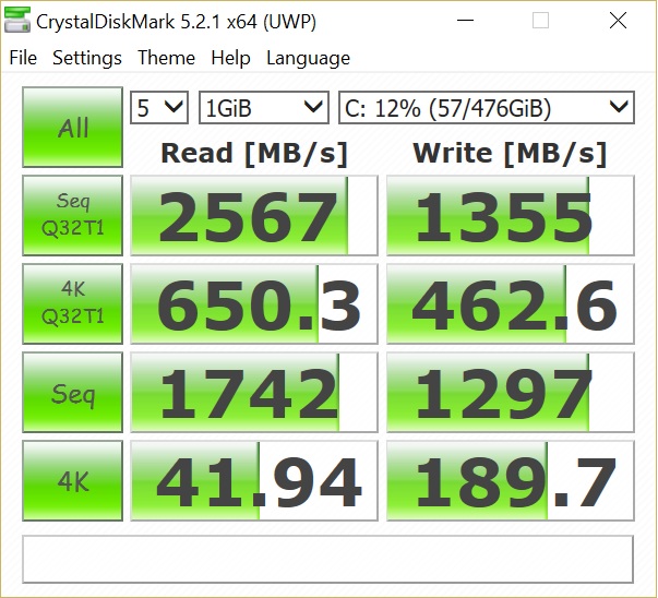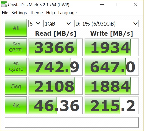 With the build complete, it was time for some testing. With 1080Ti SLI and NVMe, some strong results should be expected. Let’s see how that pans out! First up, the disk subsystem. We’re dealing with two different NVMe devices here. An older OCZ Toshiba RD400 512GB device, and a newer Samsung EVO 960 1TB. Both devices were set in the BIOS to PCIe x4. The Toshiba is M.2-0, which for some reason becomes disk 1, and the Samsung is M.2-1, which becomes disk 0. The OS was installed on the Toshiba, and the Samsung is being reserved for games. First up, the OS disk: