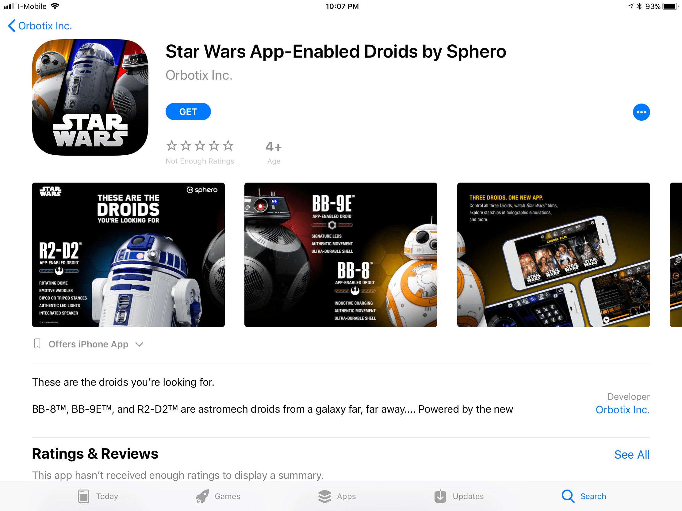 Of course step 1 of the “getting started” is basically “go get App” (welcome to the app era). IOS and Android are both supported (sorry Win Phone! At least officially… crazy enough there are Windows Phone fan made apps!). “The app you are looking for” is “Star Wars App-Enabled Droids by Sphero”…. by Orbotix Inc. They should really clean this up and make it more intuitive. Also “not enough ratings” was weird: