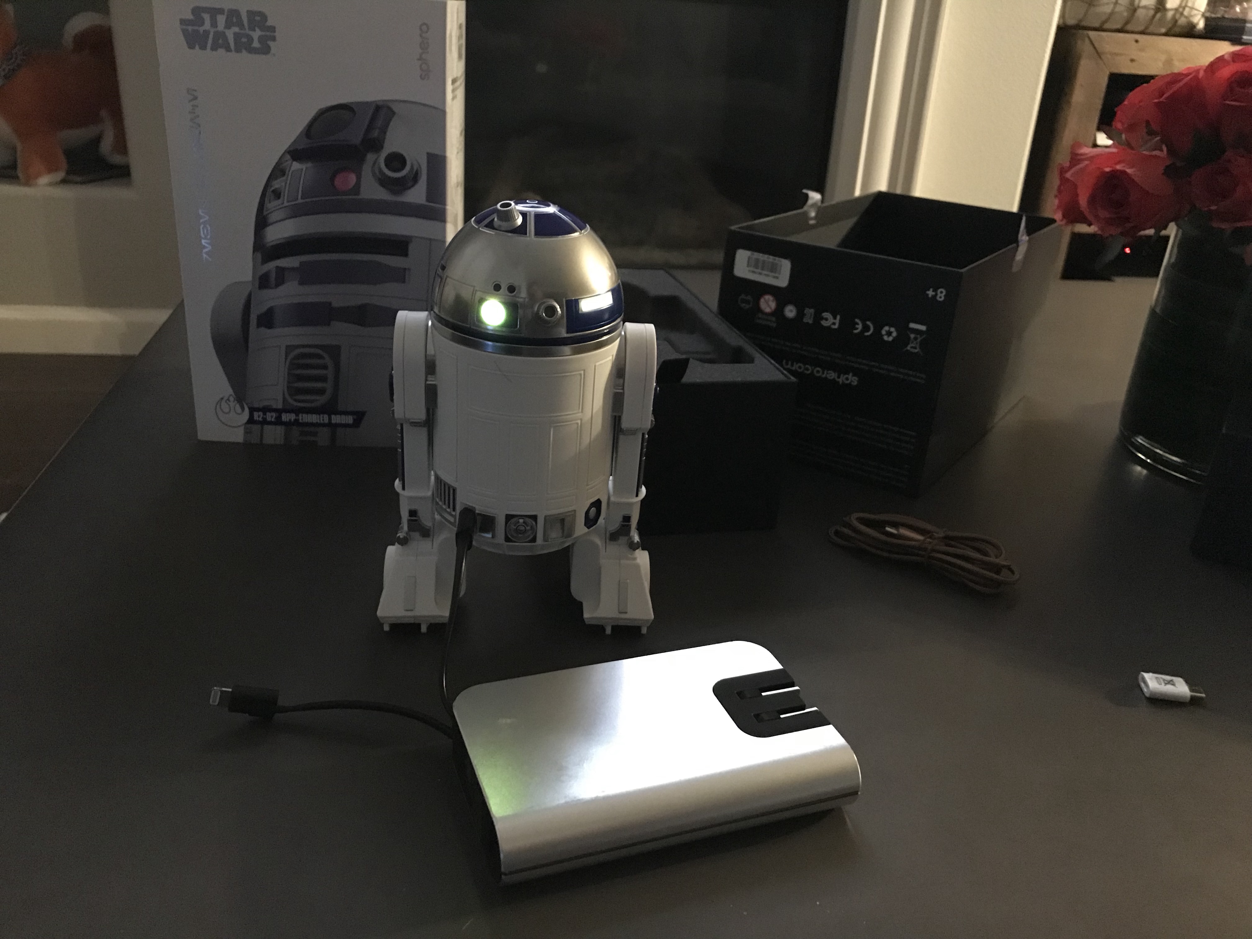 Once connected, R2 will wake up, light up, and start making noises and looking around; just like the real R2! Also, yes, the Sphero droids can be charged by a portable charger (ie this MyCharge 10K mAh) if anyone was curious: