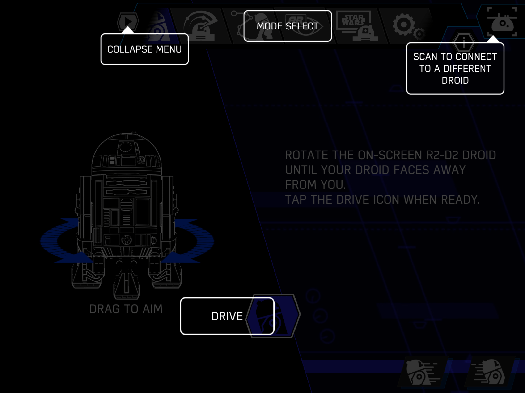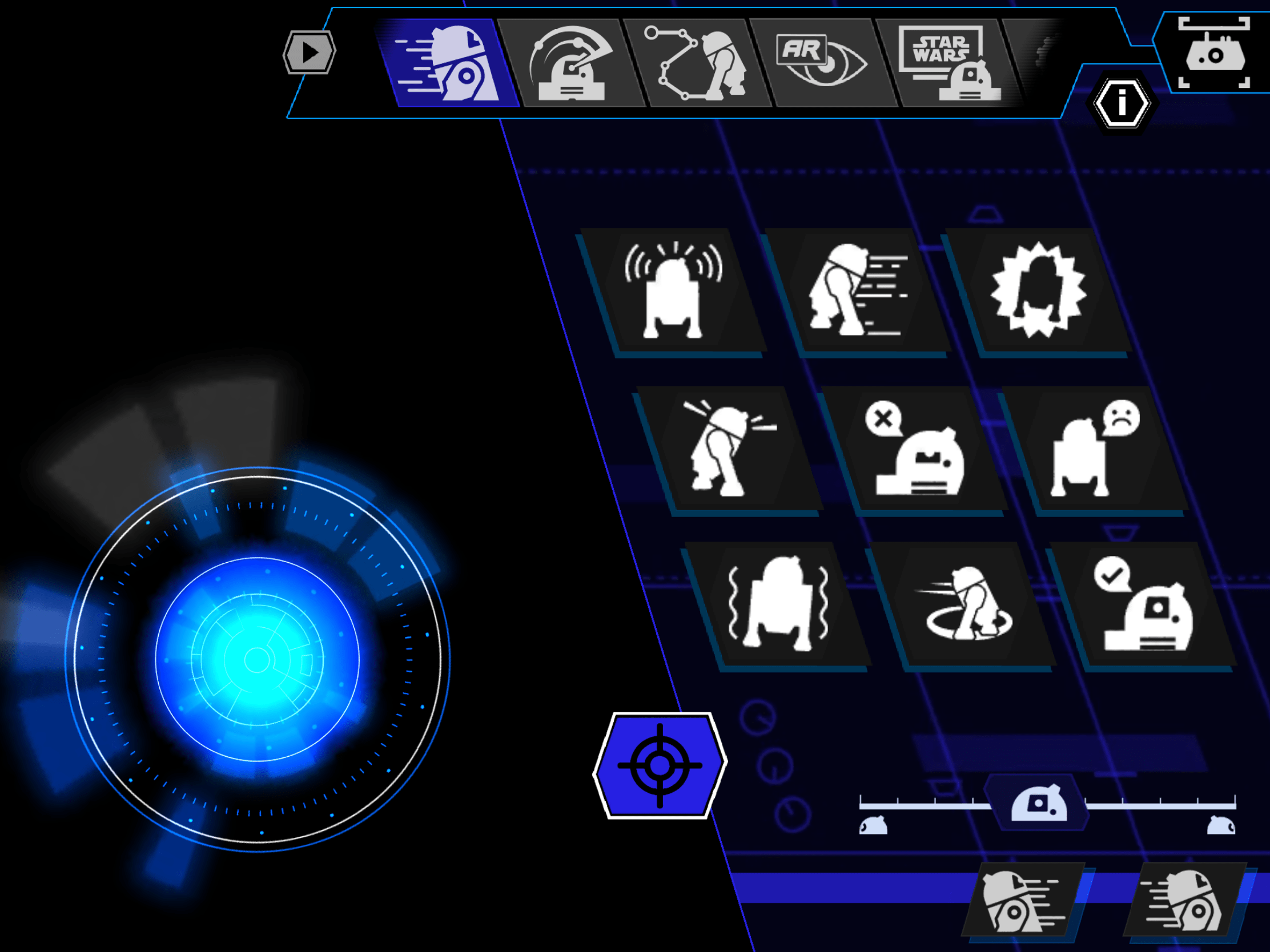 The firmware update is pretty quick (roughly 5 minutes), but it’s best to keep R2 connected to power during that time (good rule of thumb for any device). Once complete, we’re greeted with the main droid UI, in “overlay help” mode on first run. The icons are somewhat self explanatory, but the overlays give the lay of the land. Mode selection happens across the top (more on those in a bit), in cases of multi droid households, the droid head in crosshairs icon can be used to change connections, the entire menu can be collapsed using the right arrow in hexagon (Star Wars UI elements!) and the big blue R2 in hex button can be used to drive: