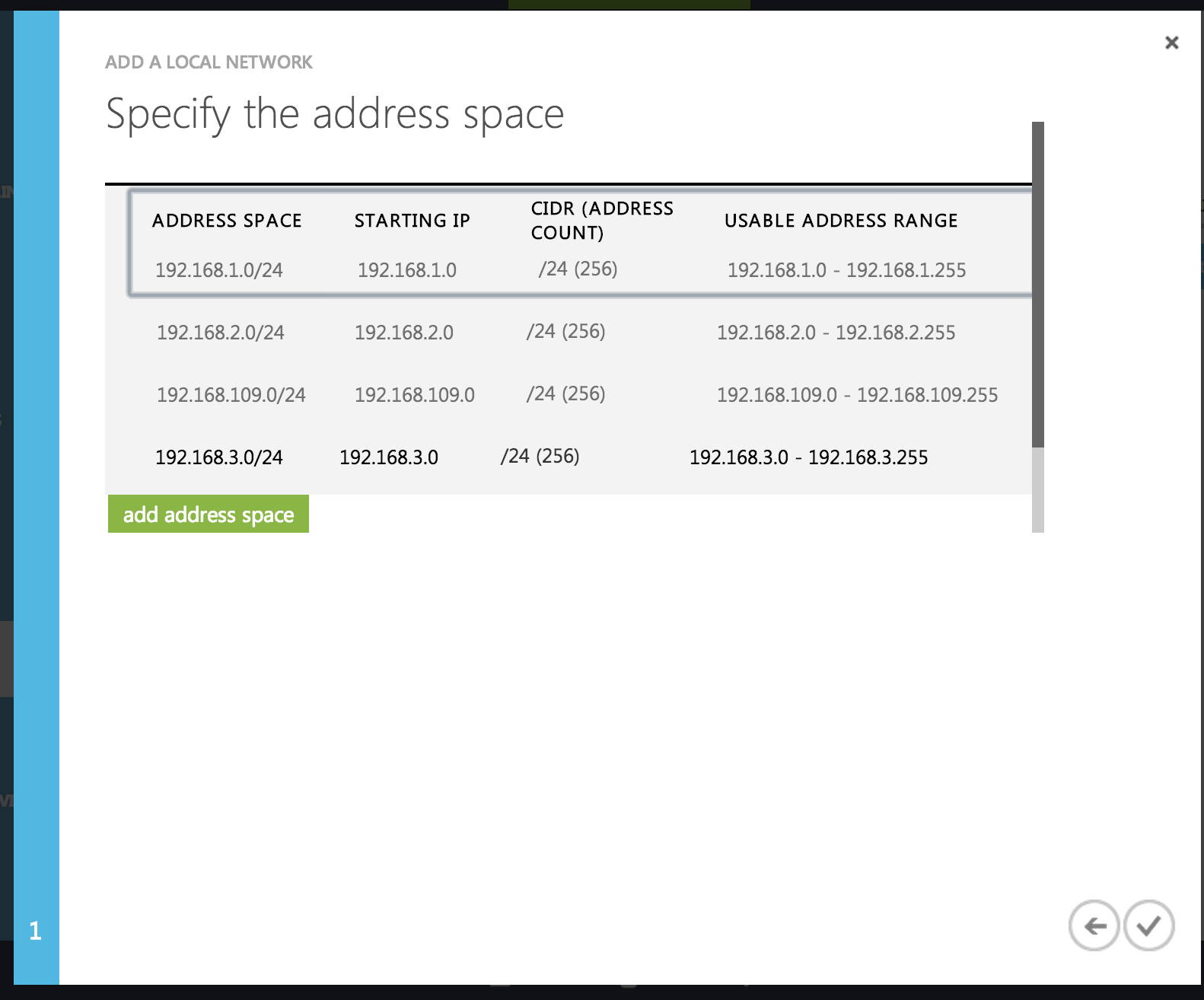 With the Virtual Network base configuration defined, we now add some address space.  The workflow is very similar to the Local Network definition.  First we set a top level CIDR block (IP subnet address and mask) and then from the CIDR we deploy one or more subnets.  We need at least one subnet as at least one must be defined as the “Gateway Subnet” as we discussed above.  So for example, if we wanted a single class C to be the sum total private IP space we have available in this Azure definition, we would set a class C CIDR block, and then allocate the entire CIDR block to a single subnet (/24) and add it as a “Gateway Subnet”.  This would give us 252 addresses to use that have a path out through the tunnel:
