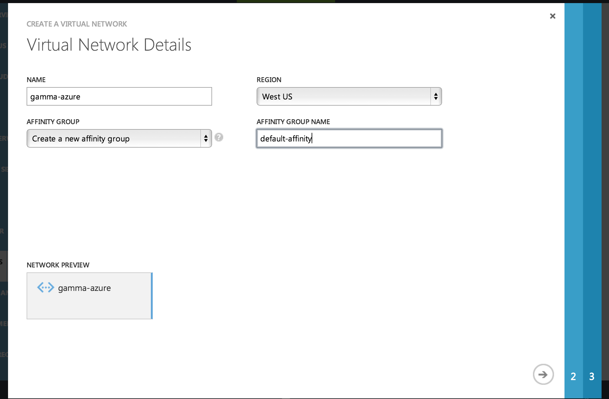 With those two steps complete, our on-prem environment is essentially configured from the Azure point of view.  Next up is to configure the Azure side of the equation.  First we define the Virtual Network space.  Once again we give it a name, but this time we are also specifying a region (this is critical as it will determine where our tunnel lands geographically from an Azure point of presence perspective.  We also assign an affinity group, or create a new one: