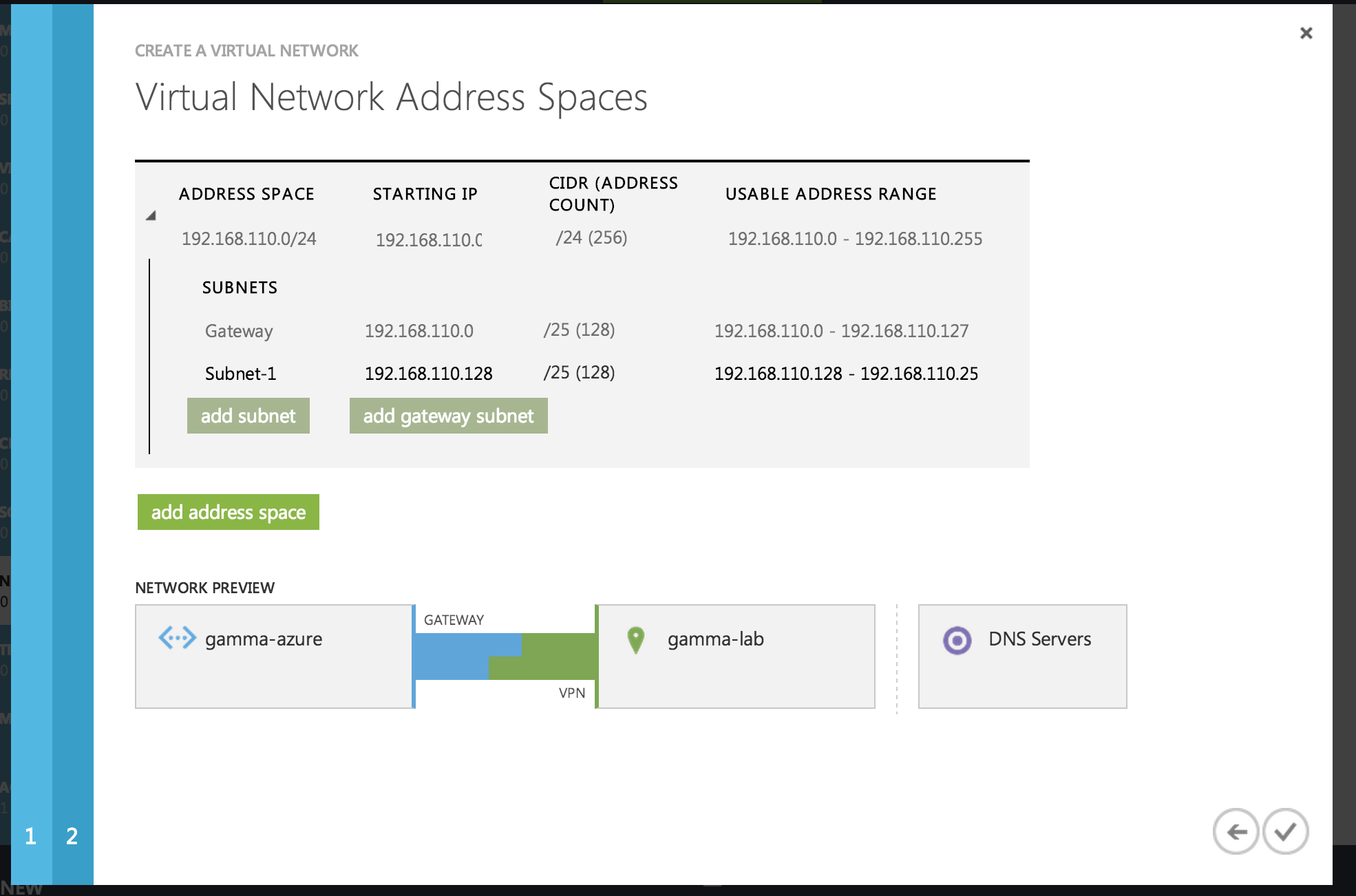 • Virtual Network – the Virtual Network definition refers to private IP space within the Azure cloud.  You can set one or more top-level CIDR blocks and then carve subnets out of them.  One of these subnets is designated as a “gateway subnet” which means it is the subnet which contains the virtual gateway out of your private IP space.  Any objects (VMs, etc) with an IP matching one of these address ranges can be routed through the VPN tunnel.