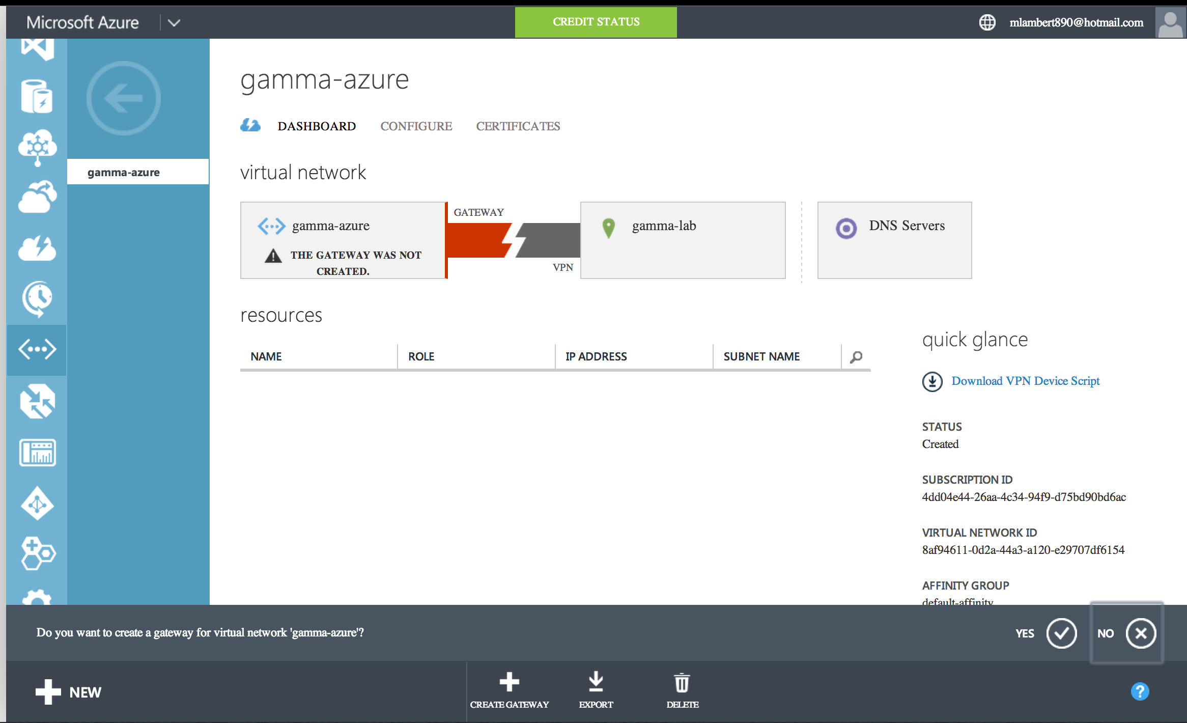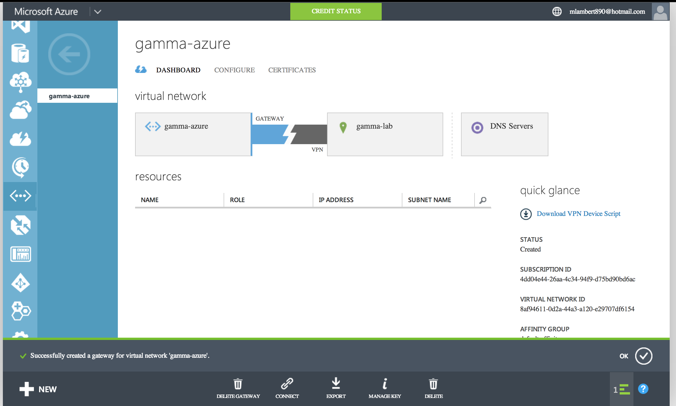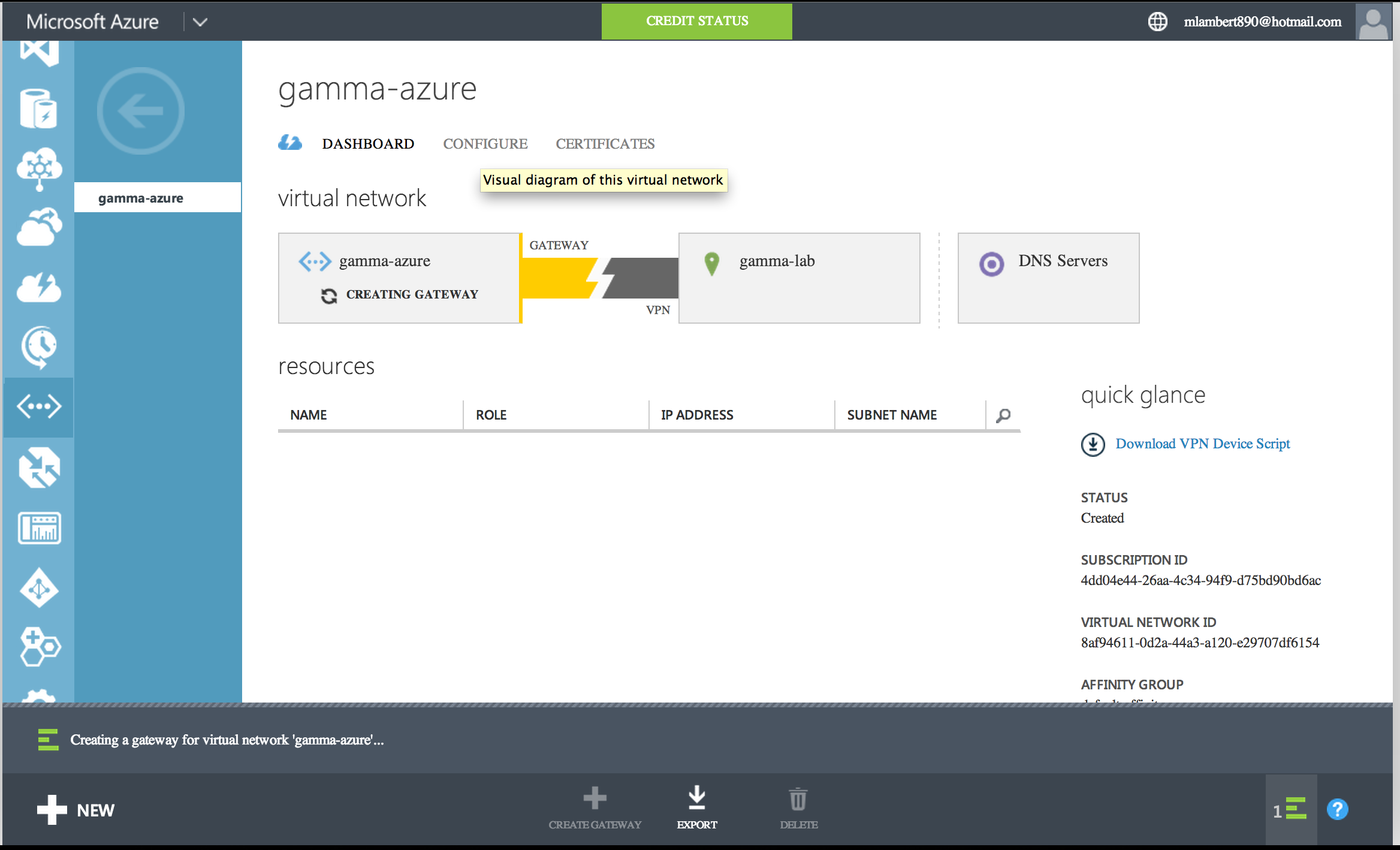 As with all Azure operations, there are verbose status updates and a nice visual representation.  Note the gateway side of the pipe is yellow: