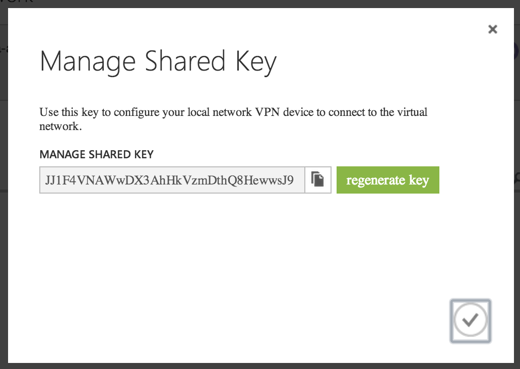 The gateway creation is pretty silent, but some interesting new options appear on the action bar once it is finished.  Most notably “Manage Key” and “Download Configuration”.  Manage Key allows us to view our IPSEC PSK and copy it to the clipboard as well as generate a new one (which I did immediately after taking this screen cap!):
