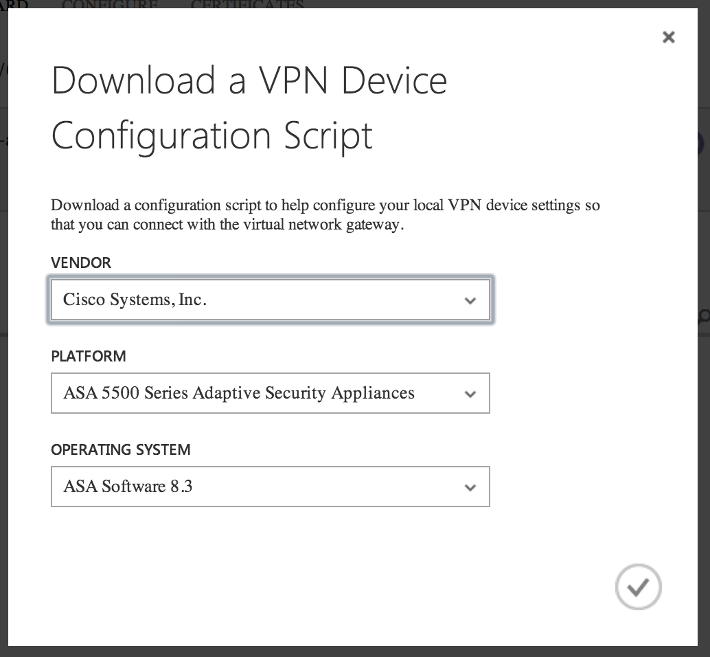 As with the AWS Customer Gateway Creation process, we are able to download a script in order to configure our on-premise equipment.  Multiple families of devices from Cisco and Juniper are supported as is Microsoft RRAS.  Unlike with AWS, there is no “generic configuration” option, but honestly any of these scripts is just structured text and human readable.  If you are configuring a pfSense, Microtik, Astaro or other open source router, any of these scripts will provide the required info.  Of course it would be nice to pull that info directly from the GUI or have the GUI offer a quick tutorial.  Microsoft has this approach down pretty solidly in some of the less complex tasks, so it would be nice to see it here where it is more needed: