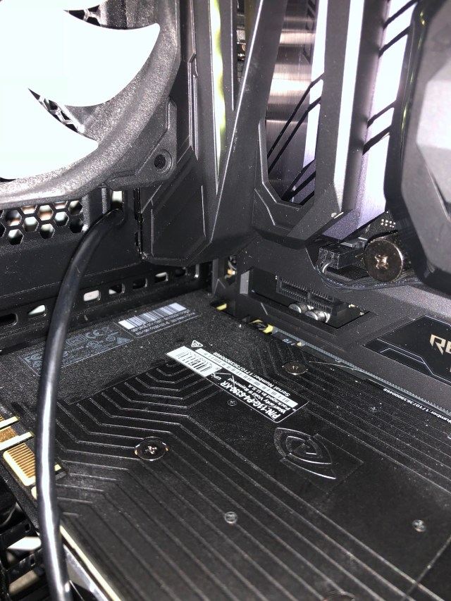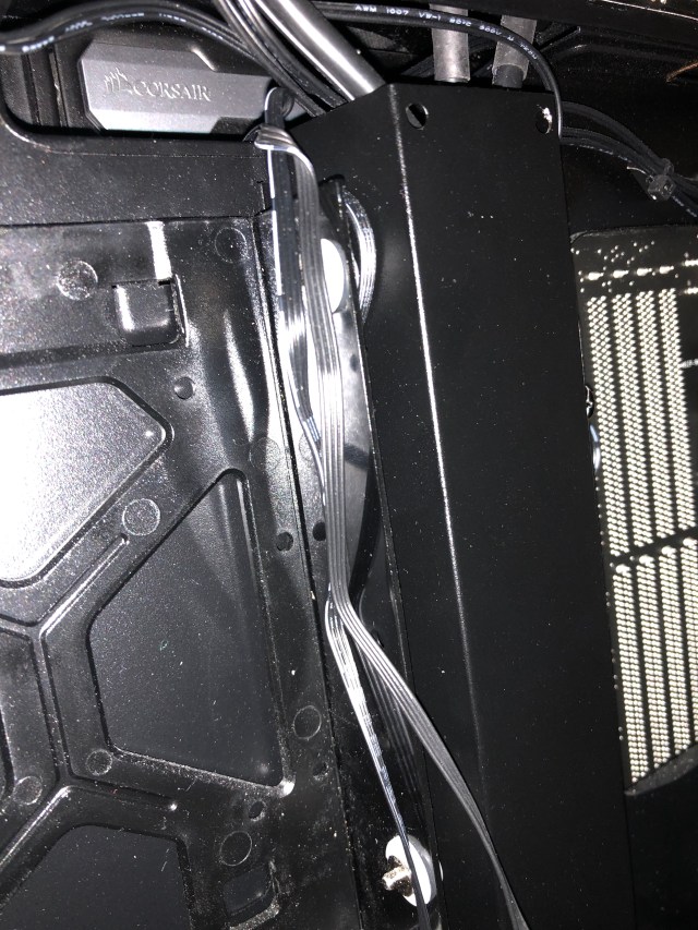 So with piggybacking both the LNP and H100i on one header out, options become pretty much limited to a Frankenstein setup. In this case, double entendre intended, the 570X does have lots of holes, for lack of a better term, through which a cable might pass. The solution here was to use a regular micro USB cable, strip the head insulation from it, exposing the bare metal connector (which should be fine – plugged in it is well away from contact with any surface):