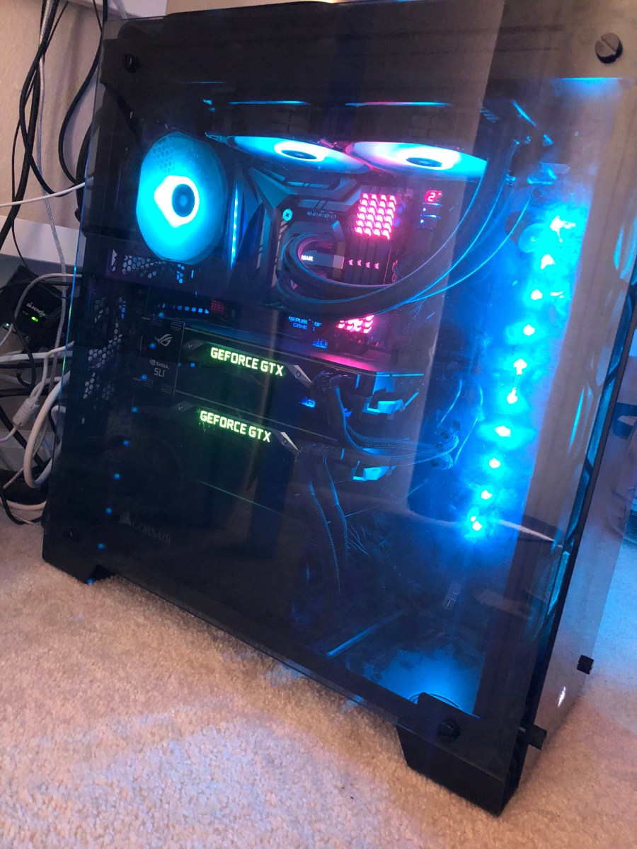– 6 x Corsair SP120 RGB – 3 up front, one in back, 2 replacing the H100i v2 fans. Note re: the H100i – The SP120are slightly lower cfm (slightly lower RPM) and are 3 pin PWM. Since the H100i header needs 4 pin PWM to control the fans this means the SP120s run at max full time when connected to the H100i. This wasn’t a problem since I normally run the H100i fans at max regardless. The SP120s are about the same thermal perf and slightly quieter