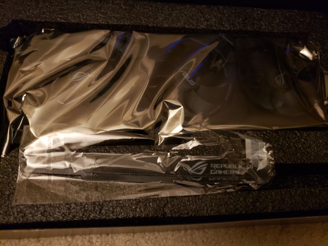Lifting off the foam tray we see a (massive) card and…. An anti-static strap with an Asus ROG logo. And that’s it. Literally. So not only are prices through the roof, but you get no cables, no dongles, hell, no stickers even!